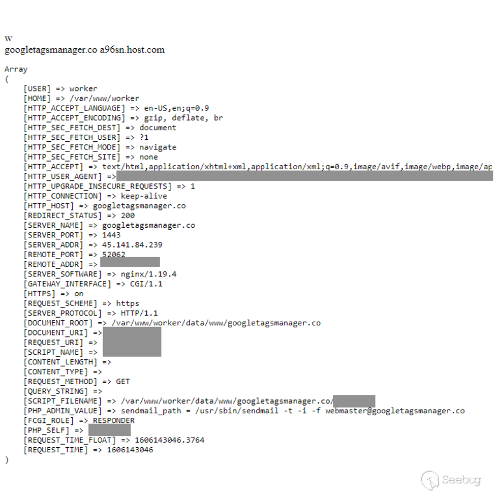 除了服務器IP地址,腳本還指定了服務器上網站文件所在的目錄hXXp://googletagsmanager[.]co/:worker。