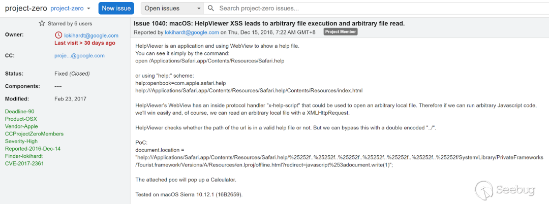 這時筆者盯上了 Project Zero 之前的一個經典案例 CVE-2017-2361。在 issue 1040 中,lokihardt 通過特殊的 URL scheme 打開本地預裝應用 HelpViewer,觸發一個反射型 xss,從而得到特權上下文中執行 Apple Script 的能力,只用一個 xss 實現了完整的遠程代碼執行。這個漏洞當時也由 redrain 獨立發現,被撞掉了。