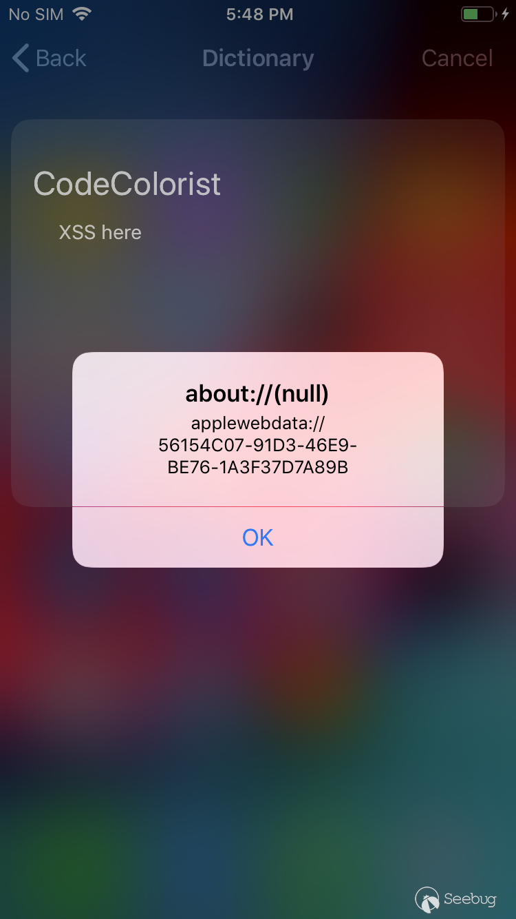在 LookupViewService 中注入任意 js 代碼之后,通過一行簡單的 location 跳轉即可打開 Dictionary,觸發第二次跨進程 XSS: