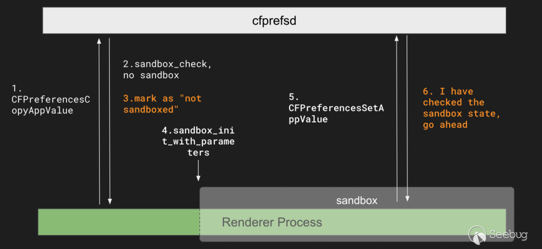 漏洞成因在于 CoreFoundation 當中的一段邏輯問題。Preferences 系列 API 用來持久化程序偏好信息,通過 plist 格式將 Objective C 當中的數據類型和鍵值對等信息保存到路徑。但實際上對路徑的讀寫操作不是在進程內完成的,而是通過一個 cfprefsd 進程作為代理,將讀寫操作使用 XPC 傳遞。cfprefsd 服務本身對讀寫操作有權限檢查,但問題出在沙箱的狀態的判定上。一個進程在訪問過 Preferences 之后,如果進程沒有 sandbox,那么 cfprefsd 會對其做一個標記。在此之后,所有的權限檢查都會優先判斷這個標記。