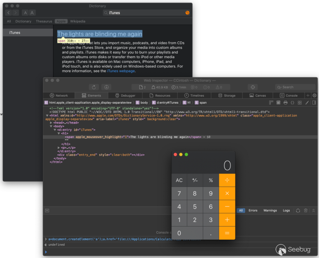 mac 系統有一個自帶的詞典應用,詞條的界面實際上是基于 WebView 渲染的 HTML。通常情況下 Dictionary 不會隨意加載第三方網頁,除了這一次。這一串漏洞利用便是前文提到的,在天府杯前兩個月被修補掉的問題。