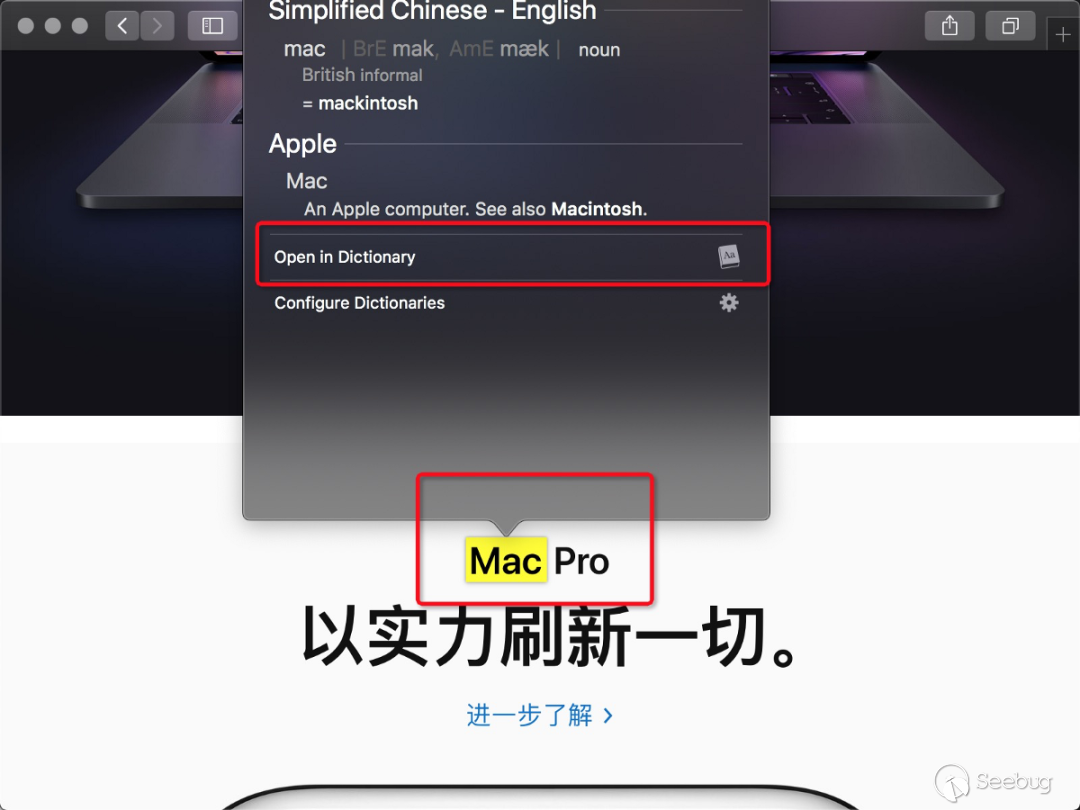 如圖所示,mac 下的瀏覽器可以直接通過 ForceTouch 的方式打開一個浮動窗口,就是一個精簡版的 Dictionary 界面。這個界面來自 LookupViewService 進程,也是一個 WebView。