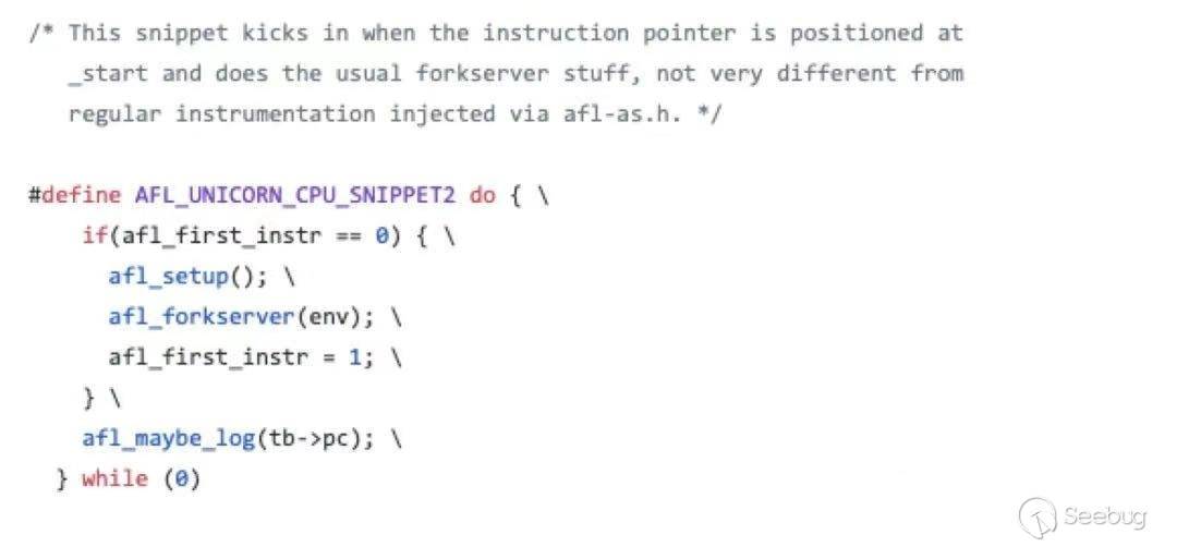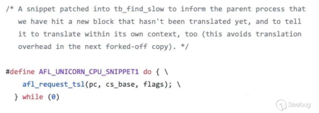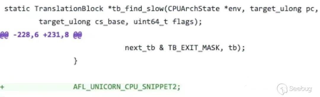 這種JIT的方式給了我們操作的空間,一種簡單的思路是與tb掛鉤,在tb_find_slow中直接掛鉤記錄當前的pc值并傳遞給AFL,如下圖所示: