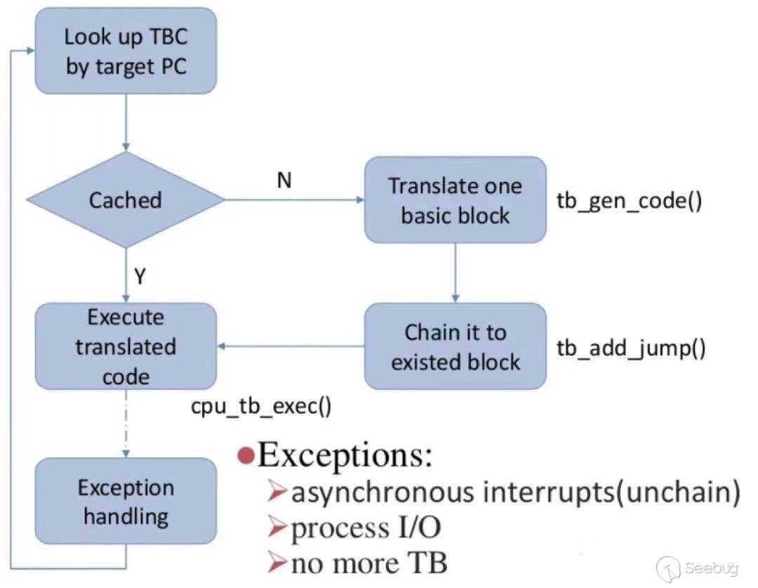 在QEMU執行目標程序時,根據指令位置查詢到對應已翻譯的TB會被直接執行,而未翻譯的TB則會被進行實時翻譯,并鏈入緩存序列中,如下圖所示: