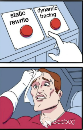 為了解決這個問題,我們首先需要確定在無源碼情況下應當如何收集Coverage。ELF/MachO的Static Rewrite和Dynamic Tracing是我們可能的選項,那他們分別是什么,對于實際環境下的目標又應當如何選擇?是996,還是11116?