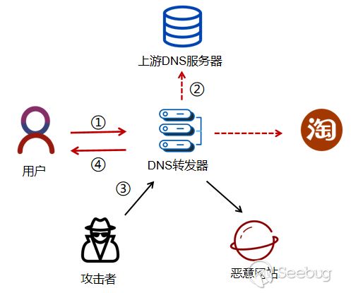 4.DNS轉發器接受了這個偽造的回復,并發送給用戶,于是用戶請求訪問的淘寶被重定向到了攻擊者操縱的惡意網站。