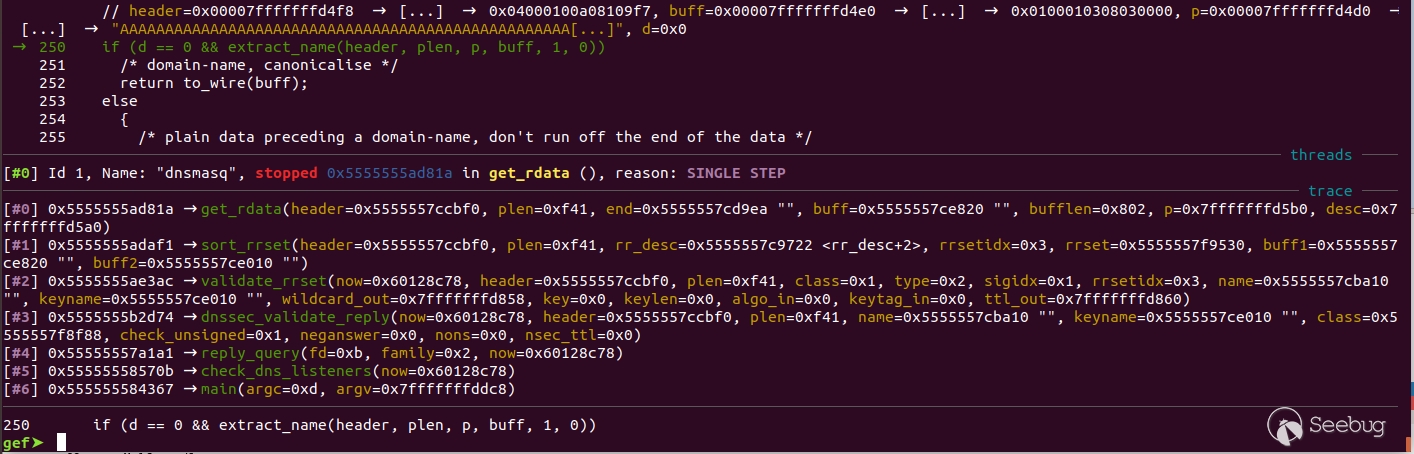 然后調用extract_name()函數解析,這里需要保證extract_name()函數解析錯誤返回0,保證進入get_rdata()函數返回為0,通過設置超長NameServer字符串即可。