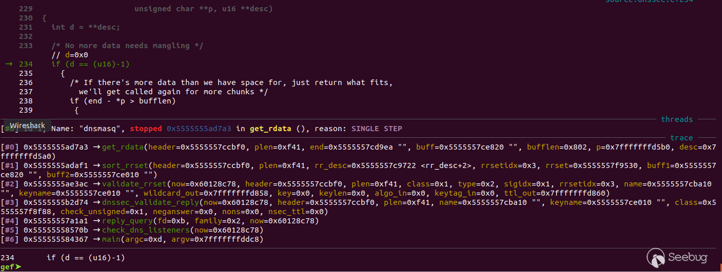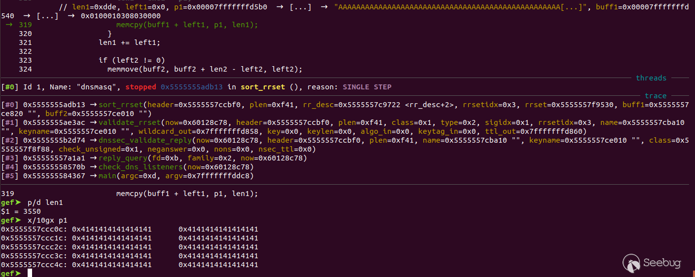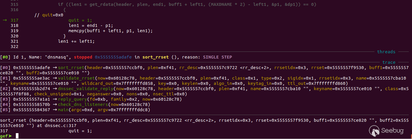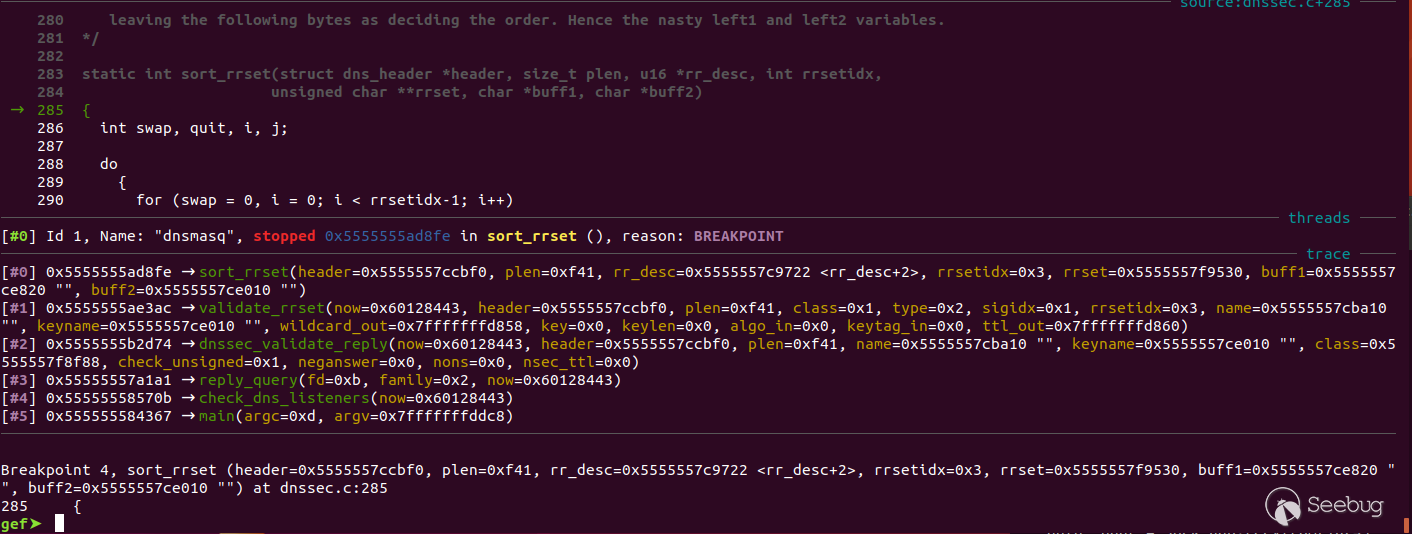 -p 53535 --no-daemon --log-queries -S 127.0.0.2 --no-hosts --no-resolv -d -q --dnssec --trust-anchor=.,20326,8,2,E06D44B80B8F1D39A95C0B0D7C65D08458E880409BBC683457104237C7F8EC8D,構造完惡意DNS查詢響應包,使用命令行:dig NS +dnssec @localhost -p 53535 .,命中sort_rrset()函數斷點后如下圖所示: