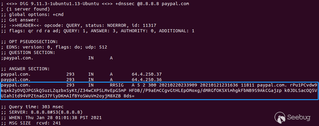 紅框中為應答部分,這是未開啟DNSSEC的情況下的。我們執行命令行:dig +dnssec @8.8.8.8 paypal.com,得到的DNS查詢結果如下所示:
