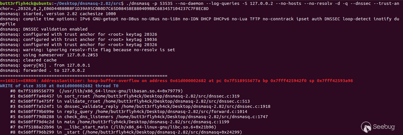 如果dnsmasq沒有編譯DNSSEC支持,那么他默認使用CRC32作為哈希算法。問題就在于CRC32從密碼學角度并不是一個安全的算法。可以很輕松的使用類似SMT solver等工具進行CRC32碰撞,這里原理不做過多介紹。