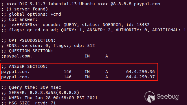例如我們執行命令行:dig @8.8.8.8 paypal.com,得到的DNS查詢結果如下所示: