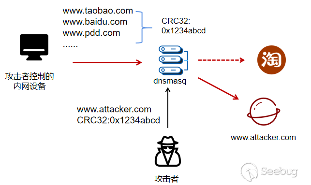 如下圖所示,攻擊者控制一臺客戶端對多個域名發起問詢,每一個CRC32的值都是相同的,然后在遞歸DNS服務器回復之前,回復一個具有相同CRC32值的域名或IP,攻擊即有可能成功。