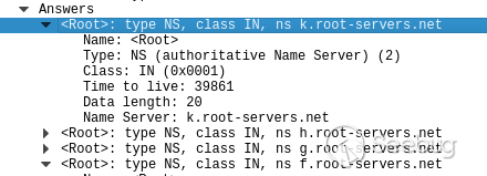 Answer,Authority和Additional三個段的格式是完全相同的,都是由零至多條Resource Record(資源記錄)構成。這些資源記錄因為不同的用途而被分開存放。Answer對應查詢請求中的Question,Question中的請求查詢結果會在Answer中給出,如果一個響應報文的Answer為空,說明這次查詢沒有直接獲得結果。