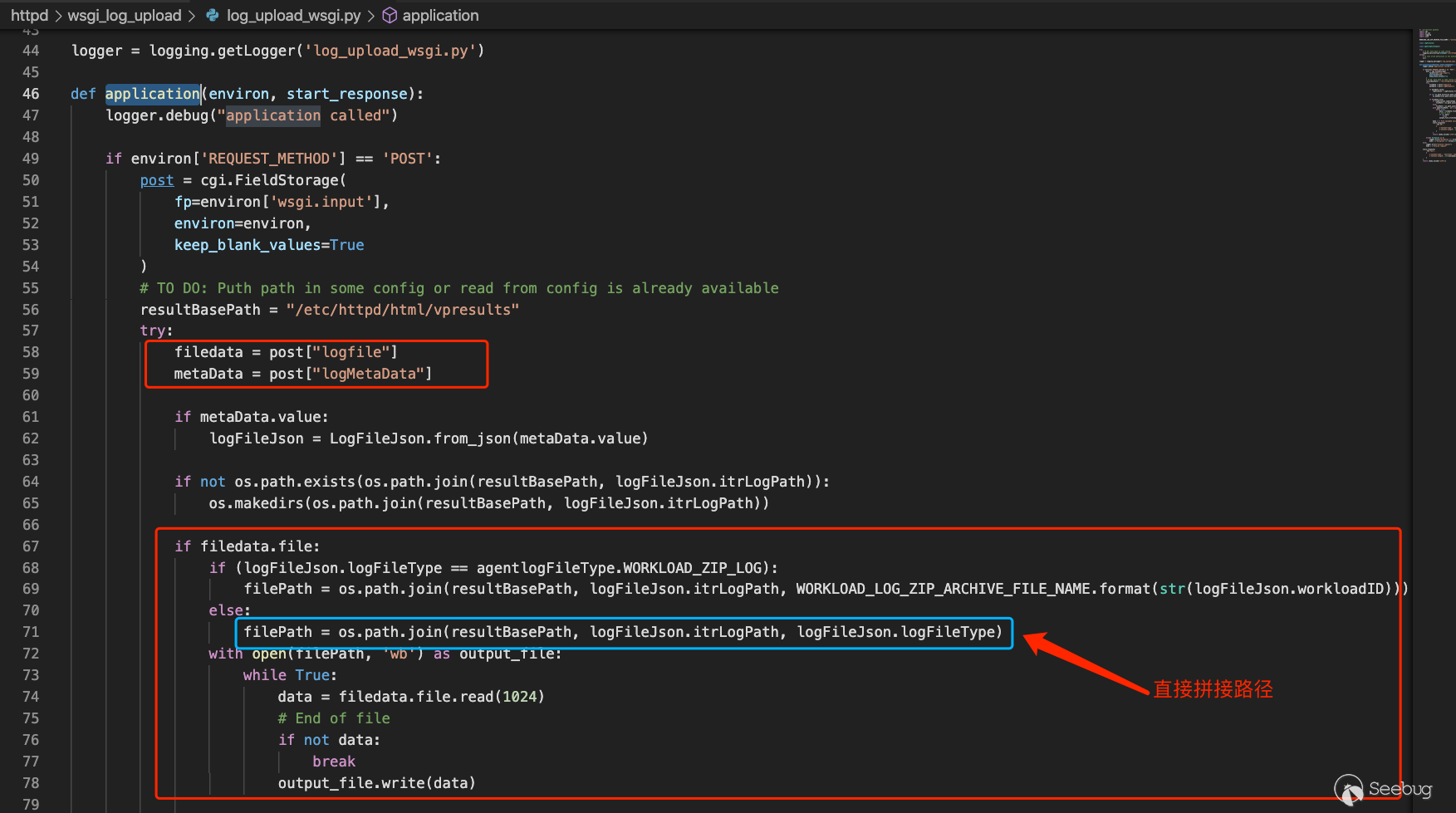 由于缺少路徑規范過濾,只需要稍微構造一下數據包即可上傳惡意文件到任意路徑,從而可以覆蓋log_upload_wsgi.py 文件,達到遠程代碼執行的效果。