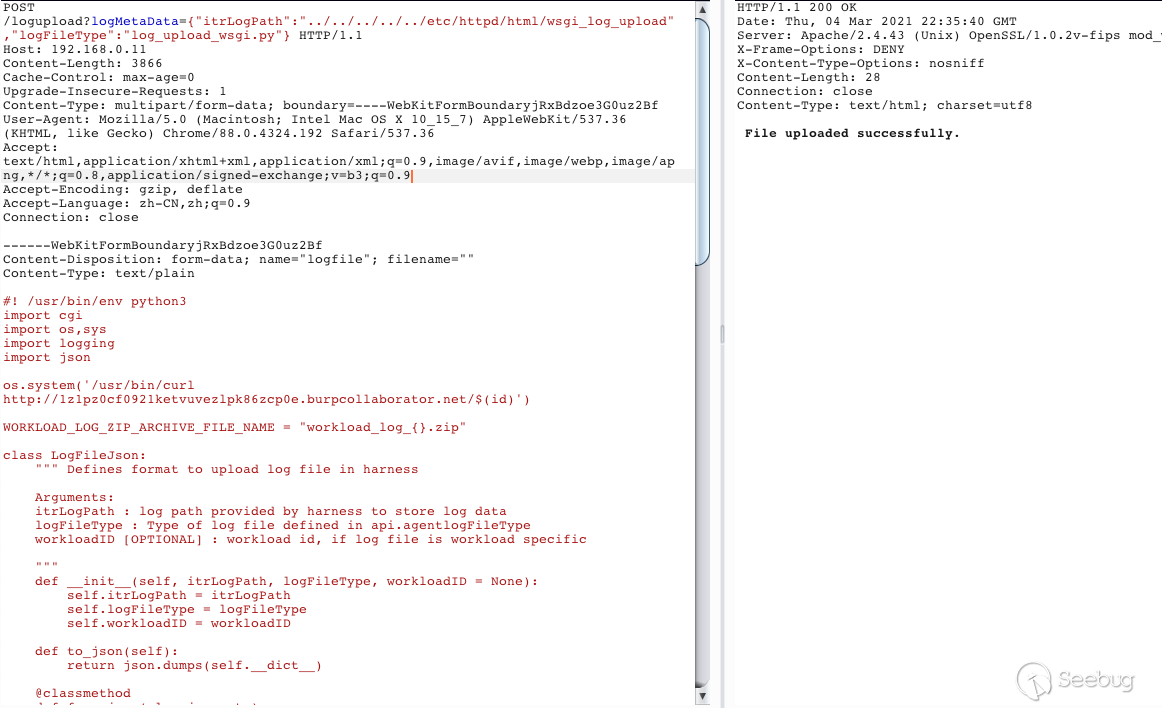 按照twitter上公開的POC,向logupload端點構造請求包(路徑使用相對路徑即可)。