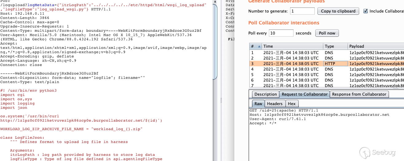 其中上傳的文件內容是log_upload_wsgi.py的源文件,但添加了執行命令的代碼,在上傳成功之后,再請求一次logupload端點,收到curl請求,命令執行成功。