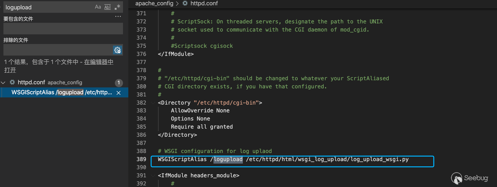 可以看到apache 配置文件配置了logupload端點的指向文件為/etc/httpd/html/wsgi_log_upload/log_upload_wsgi.py