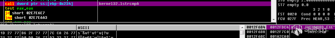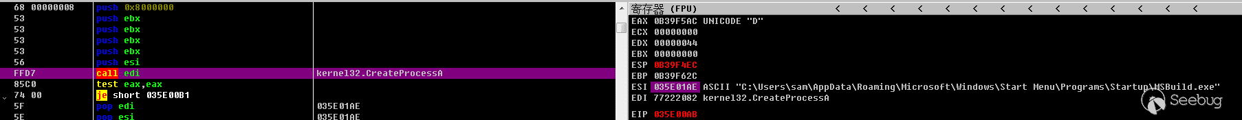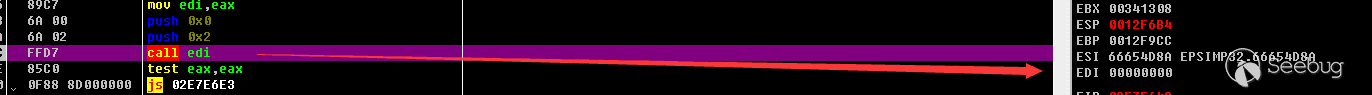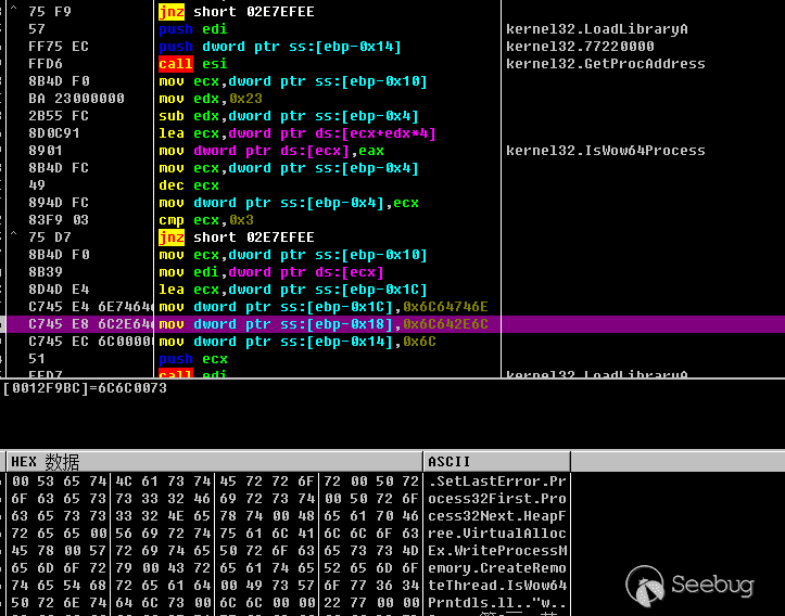 這里需要F7進去手動修改一下,因為這樣本在獲取函數地址的時候,沒有獲取到CreateToolhelp32Snapshot這個函數,導致call edi的時候edi寄存器為0,程序會出錯,需要手動修改edi的值為CreateToolhelp32Snapshot的函數地址