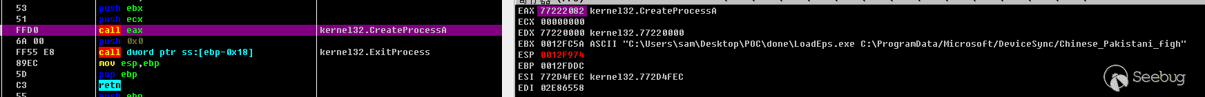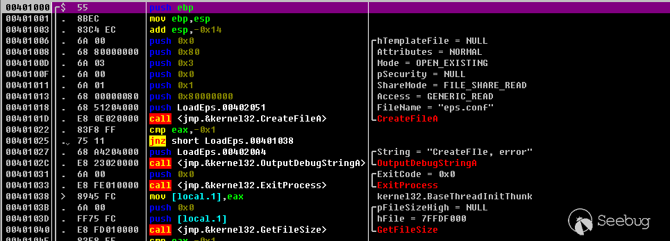 具體使用方法,將樣本的.eps惡意文件放入\done\文件夾內覆蓋poc.eps,利用loadeps.exe加載惡意.eps,然后使用OD加載loadeps.exe,這里可以用鏡像劫持加載,也可以先用OD加載loadeps.exe然后在OD內修改參數