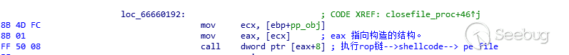 到了closefile_proc的地址,往下找到ROP鏈執行Shellcode的地方下斷