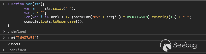 for(var i in arr) s += (parseInt("0x" + arr[i]) ^ 0x16082019).toString(16) + " ";