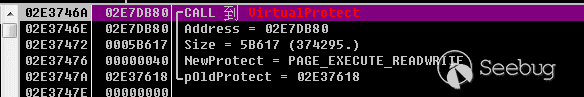 F7步入,可以發現有VirtualProtect函數修改內存頁屬性為PAGE_EXECUTE_READWRITE,這里的內存地址就是Shellcode存在的地址,可以跟過去調試了