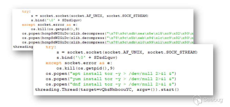 在Kaiten二進制文件中加入新的Tor功能的同時,Keksec也開始在自定義Necro有效負載中使用Tor代理。Necro是Keksec混淆python IRC惡意軟件的名稱,其最新版本由Net360捕捉。在最新變體中需要注意的關鍵特性:
