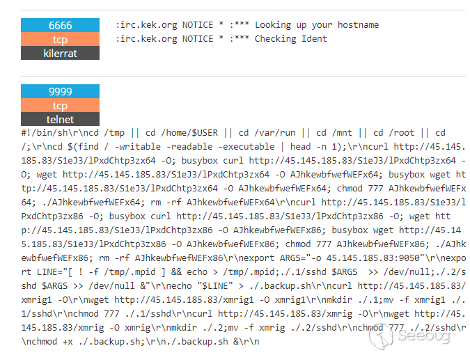 注: keksec.org僅是IRC服務器的名稱,而不是注冊域。在一個端點上,掃描儀還捕獲了XMRig安裝腳本。