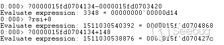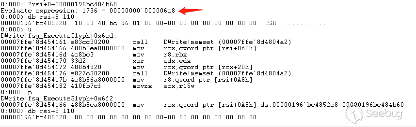 rsi+8中的數據被數組賦值時修改了,使用TTF中的數據覆蓋了[rsi+8]的數據,0x00007FFF41B341F6地址處調用的指令dd [r8+56],ax,其中ax中的數據也是可以控制的。