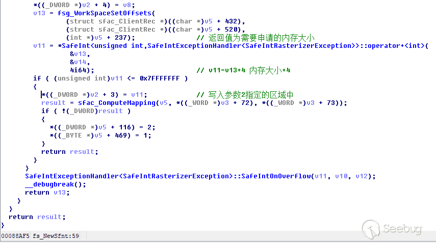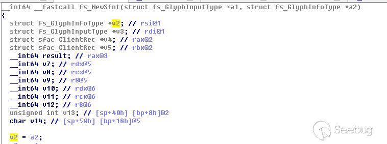 v2為傳入的第二個參數a2,*((_DWORD *)v2 + 3)與fs_NewSfnt中取內存大小區域((_DWORD )(v14 + 4i64 * j),j為3時)是一致的。