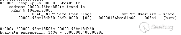查看堆塊大小以及addr1相對堆塊起始地址的偏移大小如下: