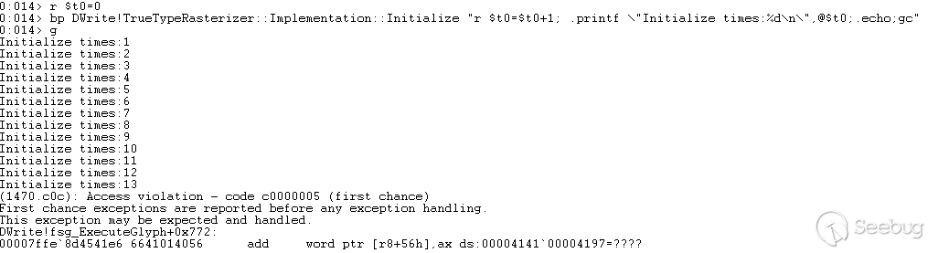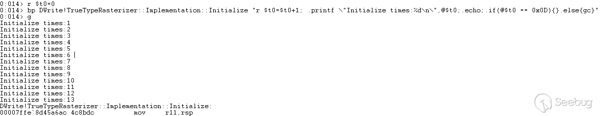 bp DWrite!TrueTypeRasterizer::Implementation::Initialize "r $t0=$t0+1; .printf \"Initialize times:%d\n\",@$t0;.echo;.if(@$t0 == 0x0D){}.else{gc}"