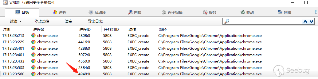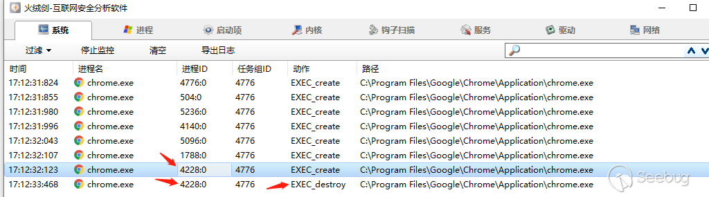 (4)可以看到最后一個進程退出,進程ID為4228,渲染引擎崩潰,進程應該也會退出,假設最后一個進程是渲染引擎進程,它創建記錄是在從上往下數第七個,再試一次,重復(2-3)的過程,這次打開poc.html之后不要點擊確定按鈕,查看火絨劍記錄如下: