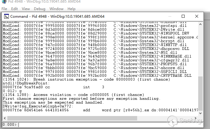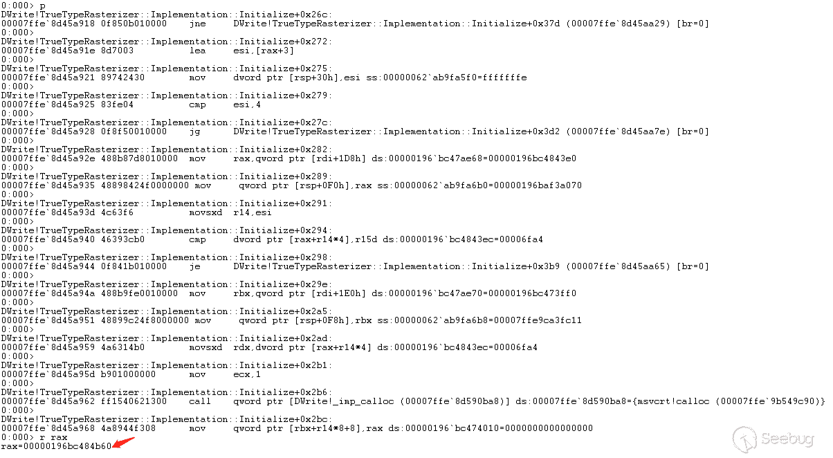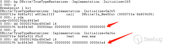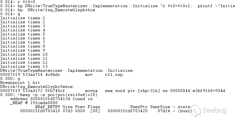 bp DWrite!TrueTypeRasterizer::Implementation::Initialize "r $t0=$t0+1; .printf \"Initialize times:%d\n\",@$t0;.echo;gc"