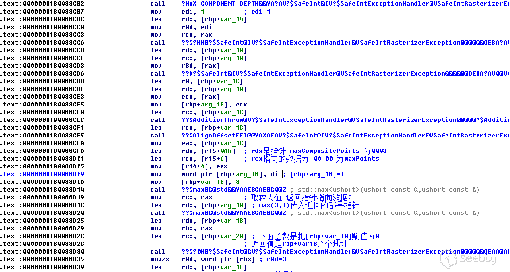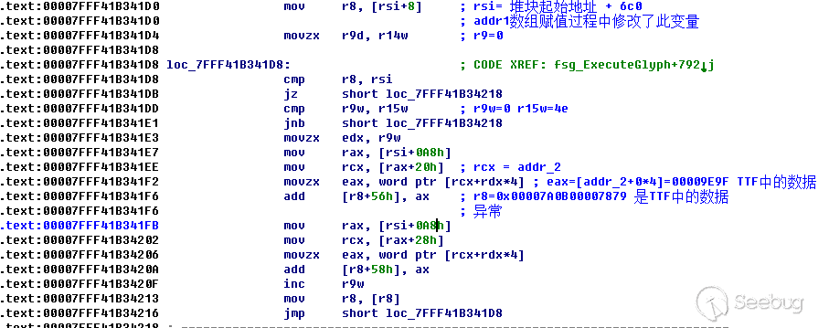 異常觸發時指令為add word ptr [r8+56h],ax,ax為 0x9E9F(圖中1標記),r8為0x00007A7B00007879(圖中2標記)的地址處,78 79 7A 7B都是TTF中的數據,補0是因為在異常指令之前對x數組和y數組調用了memset初始化內存空間。