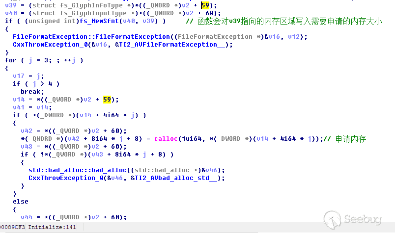 可以看到圖中調用完成fs_NewSfnt后,在下面的循環中獲取v39內存塊中的內容作為申請內存的大小。