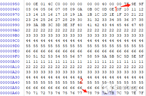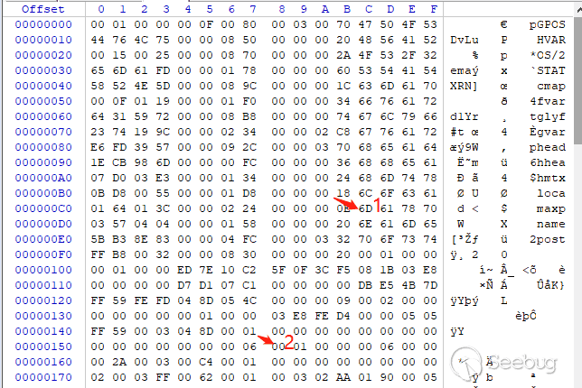圖中箭頭1指向的數據為”maxp”表的TableEntry結構,Offset字段為00000158為箭頭2所指向的地方,是”maxp”表內容的具體結構,maxPoints字段值為0(距離箭頭2偏移0x6),maxCompositePoints字段為3(距離箭頭2偏移0xA)。