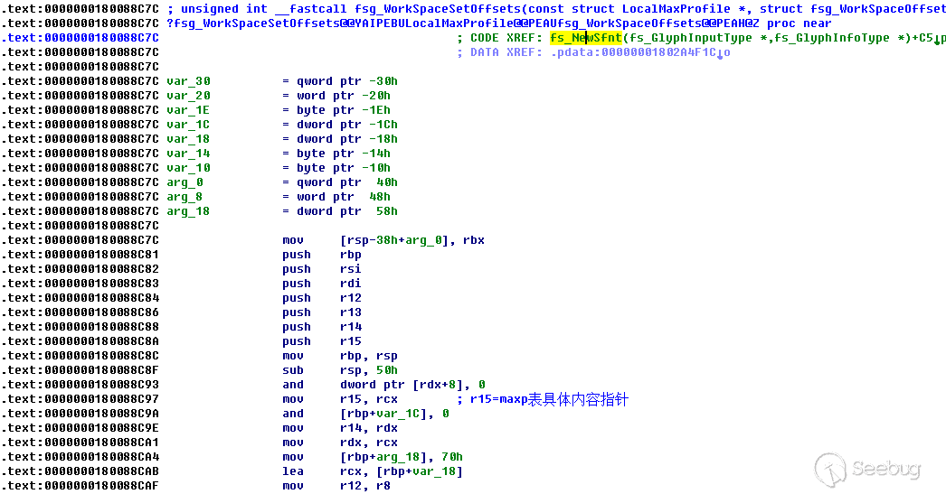 補丁后fsg_WorkSpaceSetOffsets函數偽C代碼有點問題,所以下面貼出匯編代碼如下: