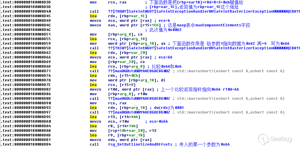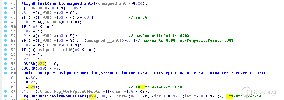 可以看到圖中從maxCompositePoints和maxPoints字段中取較大值,并且與常量1比較取較大值,得到值為3,之后加8,得到0xb,作為第一個參數傳入fsg_GetOutlineSizeAndOffsets中,這個函數看名稱應該是獲取輪廓的大小和偏移值。