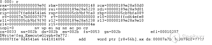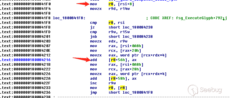 最終調用fsg_ExecuteGlyph+0x772處的指令add [r8+56h], ax時,a8來源于[rsi+8]