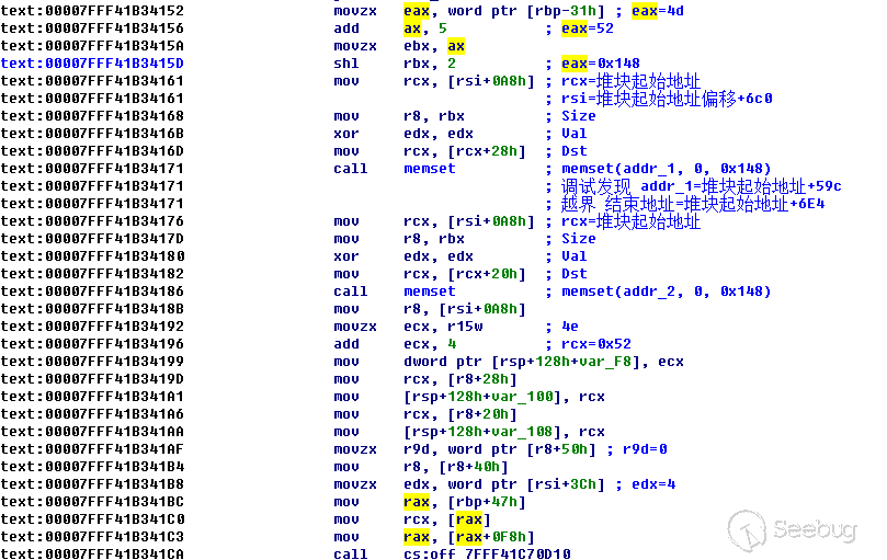 rsi+8相對于堆塊起始地址偏移0x6c8,而addr1相對于堆塊起始地址偏移0x59c,0x59c+0x148=0x6E4>0x6C8,所以操作addr1中的數據時會覆蓋rsi+8處的數據,從圖上可以看到,調用memset后rsi+8中的數據初始化為0。