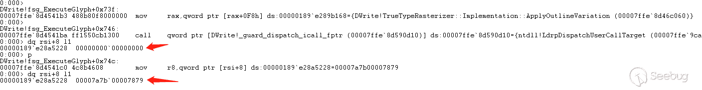 在大的堆塊中,有兩塊內存分別用于x數組和y數組,調用memset初始化,之后調用call cs:off_7FFF41C70D10 ,函數內部會調用DWrite!TrueTypeRasterizer::Implementation::ApplyOutlineVariation給x數組和y數組賦值,addr1指向的內存沒有0x148字節那么大,所以會寫到其它的數據對象上,接下里會引用被覆蓋的數據作為指針去寫數據: