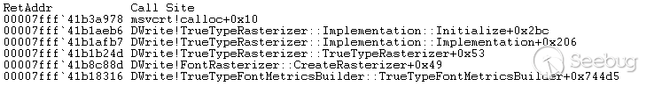 正常情況下,ttf文件中maxPoints字段值為0x168,maxCompositePoins字段值為0x2352,在poc.ttf文件中將”maxp”結構中maxPoints字段的值改為0,將maxCompositePoins值改為3,當加載并光柵化損壞的”maxp”表的數據時,會導致堆分配緩沖區過小,調用棧如下: