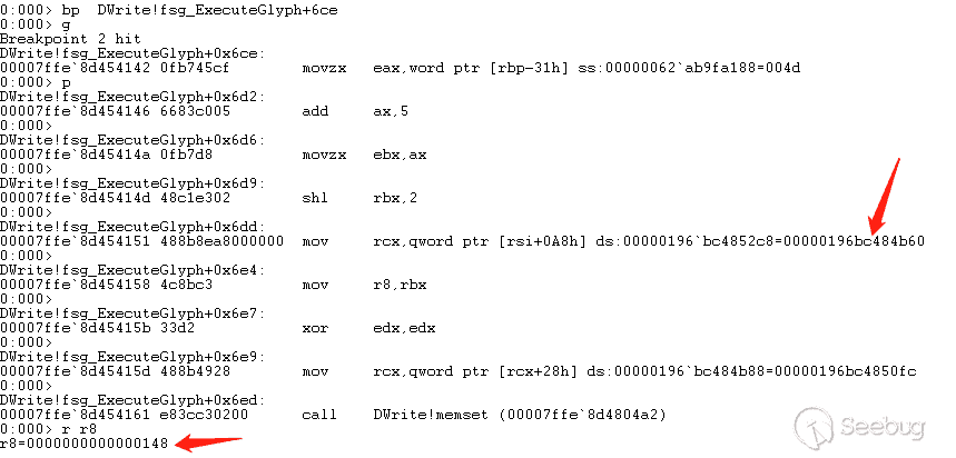 打過補丁之后查看DWrite!fsg_ExecuteGlyph函數沒有變化,調試發現整個堆塊的大小變得更大了,x數組和y數組的大小還是0x148字節,ESI對象距離堆塊起始地址的距離變大,所以在x數組和y數組的賦值過程中沒有覆蓋到ESI對象,如下: