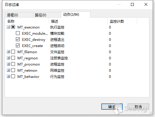(2)先關閉chrome瀏覽器(否則會影響定位結果),使用火絨劍來定位渲染引擎進程,清空火絨劍記錄內容,開啟監控,設置動作過濾包括進程啟動和進程退出,點擊確定,然后開啟監控,如下:
