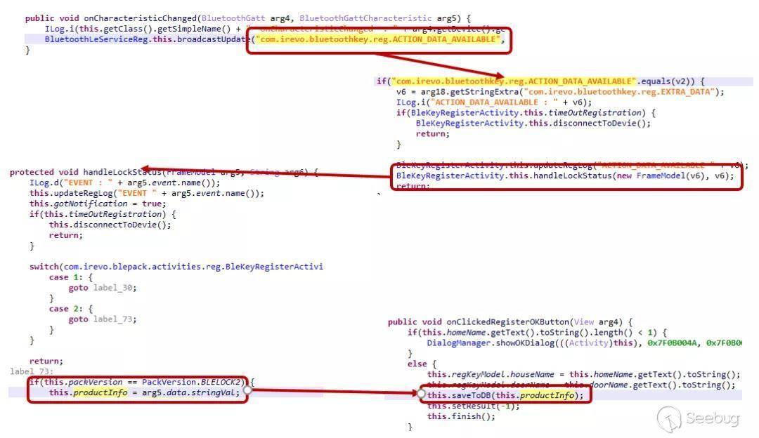 key1~key6來源于productInfo,那productInfo是哪里來的呢?我們繼續回溯,可以發現productInfo是在門鎖與手機進行綁定時,由門鎖發送給手機的,在完成綁定后,將productInfo存儲在數據庫里,每次使用時直接讀取數據庫即可。回溯過程可以參考圖2-8。