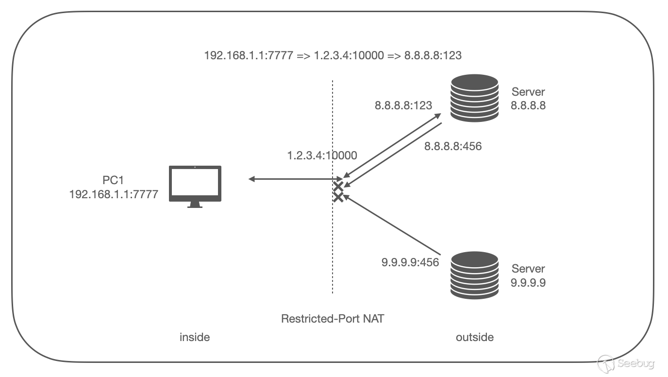 從同一個內網地址端口(192.168.1.1:7777)發起的請求都由 NAT 轉換成公網地址端口(1.2.3.4:10000),其訪問的服務器為 8.8.8.8:123,只有當 192.168.1.1:7777 向 8.8.8.8:123 發送一個報文后,192.168.1.1:7777 才可以收到 8.8.8.8:123 發往 1.2.3.4:10000 的報文。