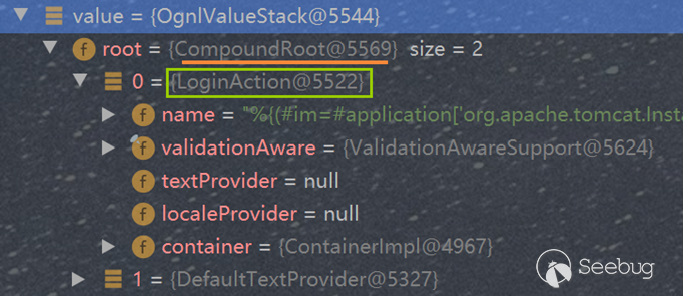而其中 root 對象是一個棧結構,每一次請求都會將請求的 action 壓入 root 棧頂,所以我們在 url 中可以輸入 action 中的屬性進行賦值,在參數攔截器中會從 root 棧中從棧頂到棧底依次找同名的屬性名進行賦值。