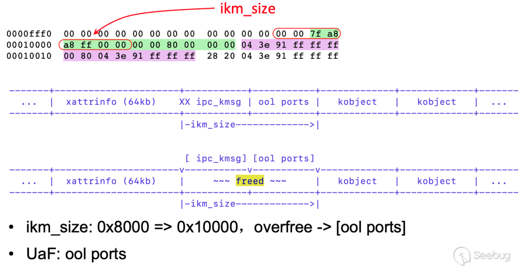 接下來需要在64kb地址邊界處,精確地對kmsg進行分割,我們把連續的3個kmsg釋放掉,重新分配3段新的內存,包含一個16 page內存頁和兩個8 page內存頁。其中的16 page內存頁預留給xattrinfo使用,它會對齊到64kb,下一個8 page內存頁同樣也會對齊到64kb,這個位置用來放置目標kmsg,是oob-swap破壞的對象,我們將會利用oob-swap把它偽造成為一個16 page大小的kmsg。下一個8 page內存頁,是ool ports page,是我們overfree的對象。經過這一系列操作,然后把oob-swap破壞掉的kmsg釋放,緊隨其后得ool ports page會一并被釋放掉,我們就得到一個完美的UaF。
