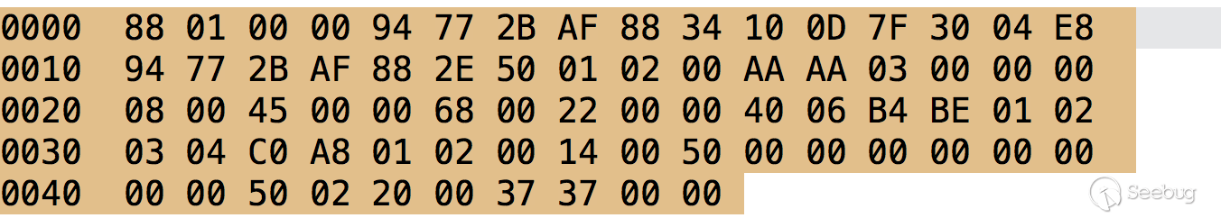 我們假設發送端發送了一個正常的802.11數據幀,這是一個里面封裝的是一個普通TCP包,其dst=“192.168.1.2", src="1.2.3.4", id=34